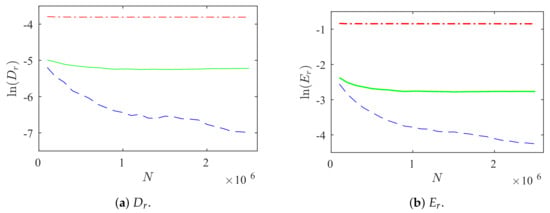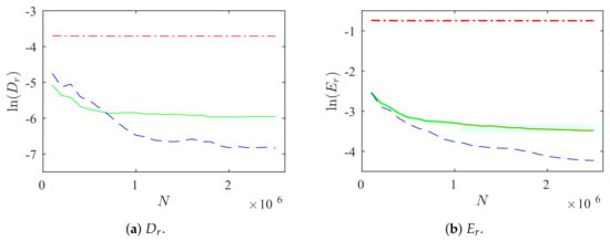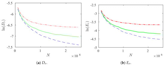 To evaluate the rate of convergence of these results, we use the Equation (40). For this set of tests, we obtain and . Then, and converge to zero when N tends to infinity with a rate of convergence and , respectively.