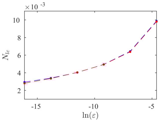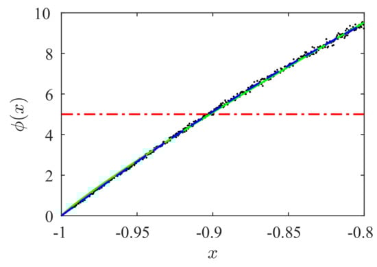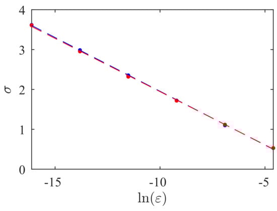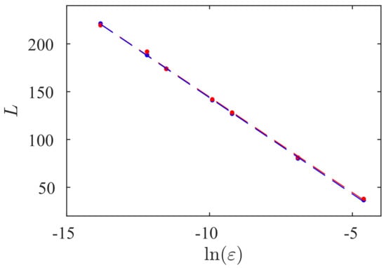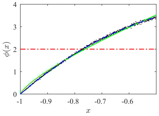 Using Equation (19), we calculate the characteristic relation for . Figure 9 shows the numerical (red points) and theoretical (blue points) results. Note that the characteristic relation can be written as