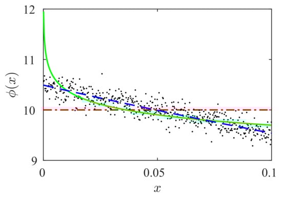 We present some numerical and theoretical results for the Manneville map (Equation (41)). We study two sets of tests with different parameters. The first set uses , , N = 100,000–2,500,000 and . The results are shown in Figure 7a,b and Figure 8. Figure 7a,b show the evolution of and vs. N. The results evaluated by the density technique are the dashed blue line, the green line corresponds to the M function methodology, and the red line to the classical theory. From these figures, we observe that the density technique approximates more accurately the RPD than the M function methodology and the classical theory. Figure 8 shows the RPD functions, the blue line is the RPD calculated by the density technique (Equation (48)), the green line is the RPD obtained by M function methodology (Equation (34)), the red line represents the classical RPD, and the black points are the numerical data. We note that the theoretical RPD calculated by Equation (48) captures accurately the numerical data. In addition, we emphasize that the RPD is approximately constant.