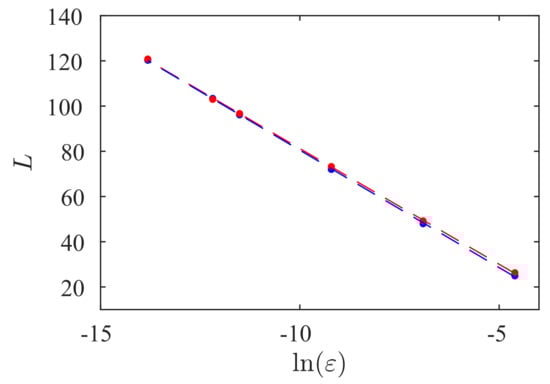 For each reinjected point x, there is a laminar length , which determines the number of iterations that the trajectory needs to move from x to the boundary of the laminar interval c. Thus, the PDLL function establishes the probability of finding laminar intervals of length l. Usually, the PDLL function is obtained from the RPD function as follows [,]
