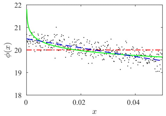The second set of tests uses the following parameters , , and . Figure 4a,b show and , respectively, for N = 100,000–2,500,000. Similar to the previous tests, as the number of reinjected points increases the accuracy of RPD calculated by the M function and the new theoretical formulation increases too. Again, the classical theory has the worst behavior. Additionally, we note that the errors generated by Equation (32) are lower than those obtained from Equation (34). As in the previous set of tests, the M function methodology obtains . Theoretical and numerical RPDs are shown in Figure 5, the black points are the numerical data, the blue, green, and red lines are the RPD functions given by Equations (32) and (34) and the classical theory, respectively.