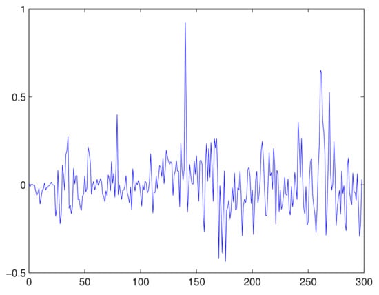 where , , , and . The innovation satisfies Assumption 1. We set the tail index . This heavy-tailed sequence is generated by a small program that can be downloaded from Professor Nolan’s website: https://edspace.american.edu/jpnolan/, accessed on 20 May 2021.