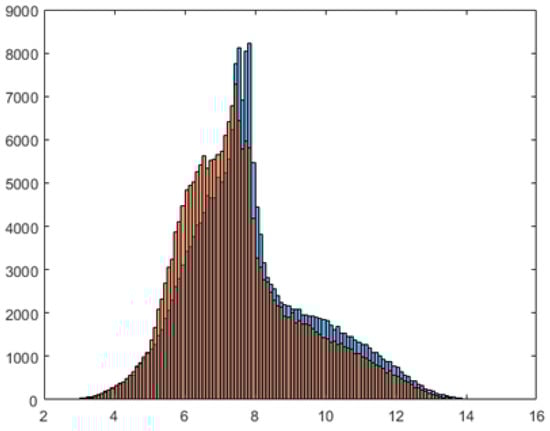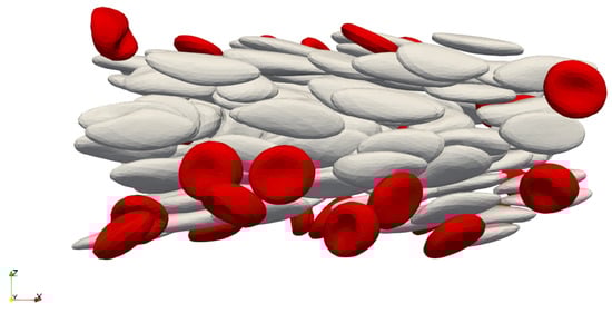 Figure 4 shows simulated RBCs in the channel. Gray cells with represent healthy RBCs, while red cells with represent diseased RBCs. Table A3 shows the names of used simulations, and, for each simulation, we list the number of time records for a cell in the corresponding experiment. Some of the simulations are based on the previous ones. (In this case, the name of the new simulation differs from the name of the original simulation only by letter e.) The first letter (or pair of letters) of the name of a simulation indicates the initial location of the cells. The number that follows indicates the proportion of diseased cells in the blood, and the last lower case letter indicates the rigidity of the diseased blood cells. (The letter a indicates the most rigid diseased blood cells (), while the letter c indicates the least rigid diseased blood cells ().)