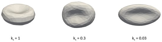 The RBC model is discrete, consisting of a triangulation of the RBC surface. The modeled suspension contains 154 RBCs, each with 374 nodes. This represents a hematocrit, which corresponds to the flow of blood in narrow blood vessels. We used data from 13 simulations. Individual simulations differ in the ratio of healthy and diseased RBCs, in the rigidity of diseased RBCs, and the initial location of RBCs. The rigidity of RBC is determined by its elastic parameters. Stretching coefficient has the largest influence on RBC rigidity, thus we determine the rigidity of the RBCs by the value of the stretching coefficient . Figure 3 shows shapes of diseased blood cells depending on the value of the stretching coefficient. In the individual experiments, all diseased RBCs had the same elastic parameters, which we list in Table A1 in the appendix. Similarly, the elastic parameters of healthy RBCs (also shown in Table A1) and their mutual interactions were also the same for all experiments.The parameters of the fluid are listed in Table A2.