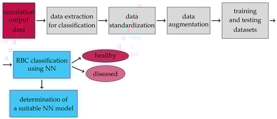 In the diagnosis of various diseases such as sickle cell anaemia, malaria, diabetes, or leukemia, it is important to detect diseased cells in a blood sample, see [10,11]. Diseased RBCs lose their natural elasticity and become more rigid. In the study [12], it was shown that more rigid RBSc infected with malaria are pushed by the healthy RBCs to the edges of the flow. This observation was used to distinguish diseased RBCs from healthy ones by using a microfluidic device with side outlets. Diseased RBCs behave similarly to leukocytes in blood vessels with a diameter of less than m. RBCs, which are smaller in size and more deformable than leukocytes, migrate to the axial center of the vessel due to the flow rate gradient in the vessels, while the leukocytes are pushed to the walls of the vessel. In this paper, we use a neural network model to address the problem of distinguishing RBCs with other elastic properties and determining the ratio of diseased and healthy RBCs in the blood flow. A sufficiently accurate classification model should not only be able to find diseased cells but also to determine their number in the hematocrit. This makes it possible to diagnose and determine the severity of the disease and then apply the appropriate treatment.