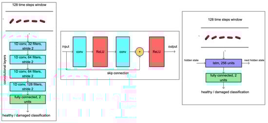 On the left—convolutional neural network architecture Conv, in the middle—the scheme of the residual block of the network ResNet and on the right—the architecture of the recurrent neural network LSTM.