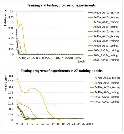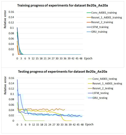 Training and testing progress of models for five different network architectures during 50 training epochs. The progress of the experiments is shown as the relative error of the accuracy of the experiments in the individual epochs.