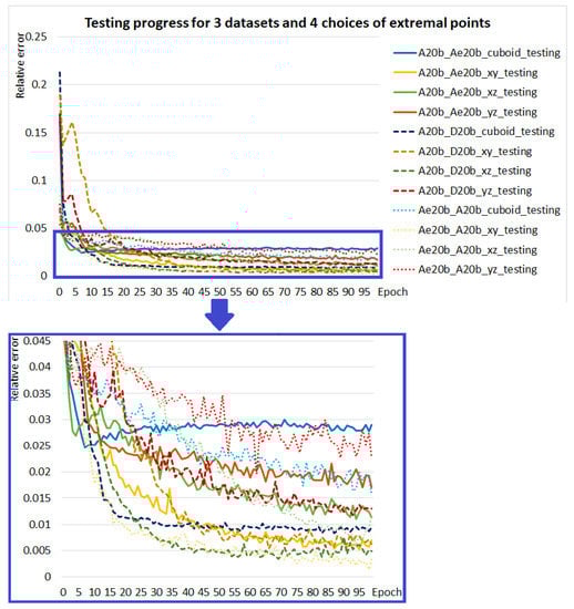 For the Be20a_Ae20a dataset, the Conv_4d001 network for 11 different selections of extremal points as NN input data was tested. We chose the positions of all six extremal points in all directions (with or without the center of the cell), four extremal points for all three coordinate planes in all directions (with or without the center of the cell) or four extremal points only in the direction of the selected planes (without the center of the cell). All experiments achieved accuracy in both the training and the testing phases.