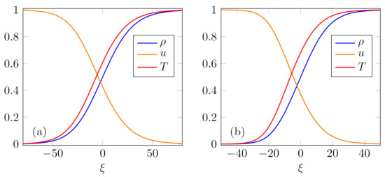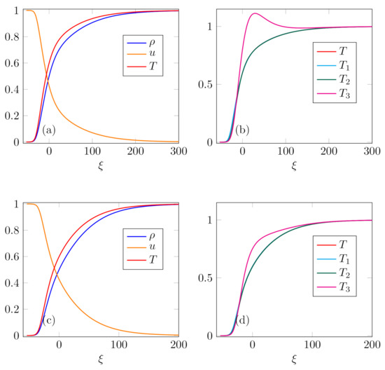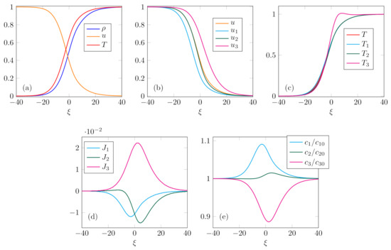 Figure 4. These results give an insight into the influence of mass ratio on the shock structure. In case (a), in the mixture with disparate masses of constituents, one may observe the temperature overshoot in