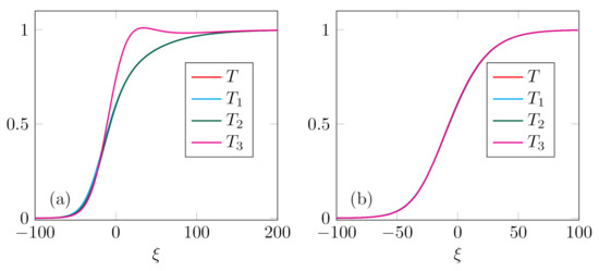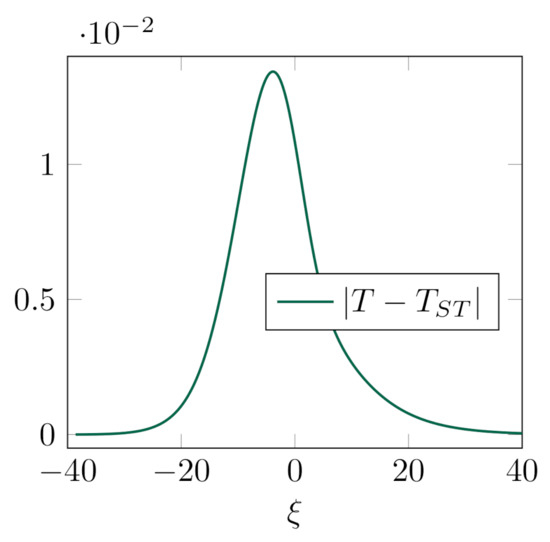 Our intention is to quantify the discrepancy in mixture field variables, primarily in the average temperature of the mixture, which appears within the shock profile computed for MT model, and the one computed for ST model. To that end, we compute the sup-norm of the difference of numerically computed solutions, i.e., , where denotes the temperature field along the shock profile in ST model.