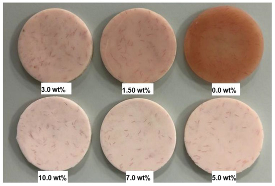 Photograph of the specimens HI PMMA acrylic resin with different wt.% of zirconia after polishing for two minutes.