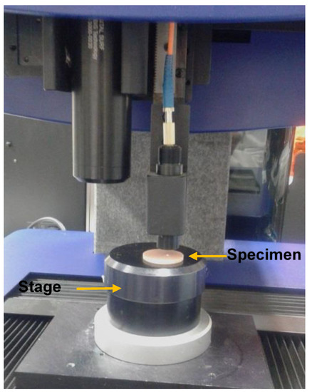 Ra measurement for all the specimen groups was conducted by using a non-contact high-resolution measurement profilometer (Talysurf CLI 1000, Ametek Taylor Hobson Precision, Leicester, UK) (Figure 2). Before measuring the Ra, the specimen was placed over a flat surface above the cross-slides of the instrument and scanned by applying a beam of white light through a lens with a chromatic length aberration (CLA 300 µm gauge) focusing on the area of surface measured (1 × 1 mm) with 0.25 mm cut-off length. The mode of measurement was bi-directional with a sampling rate of 500 Hz and a maximum spacing of 1 µm. Three measurements of surface roughness were completed per specimen. The surface roughness results were analyzed with TalyMap software (Ametek Taylor Hobson Precision, Leicester, UK) to create two-dimensional (2D) and three-dimensional (3D) surface profiles. Average roughness values of the specimens from each group were calculated and used for the analysis [32].