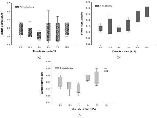 Box plot graph showing surface roughness of denture base materials (A) without polishing, (B) with polishing for one minute, and (C) with polishing for two minutes.