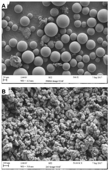 Particle surface morphologies of (A) PMMA and (B) Zirconia.