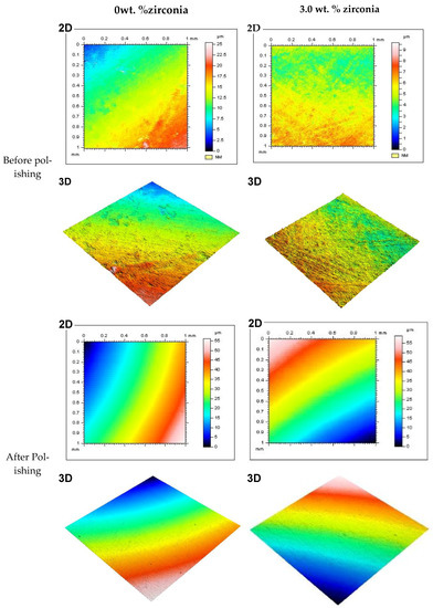 Representative 2D and 3D surface images for tested specimens in groups containing 0 wt.% and 3 wt.% of zirconia before and after polishing (two minutes). Note: Color bar for the 2D images also represents the 3D images.