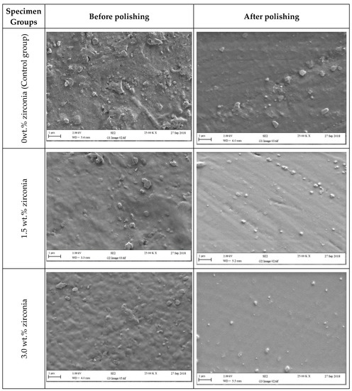 Representative SEM micrographs of tested specimens in groups containing (0 wt.%, 1.5 wt.%, and 3 wt.% of zirconia) before and after polishing (two minutes).