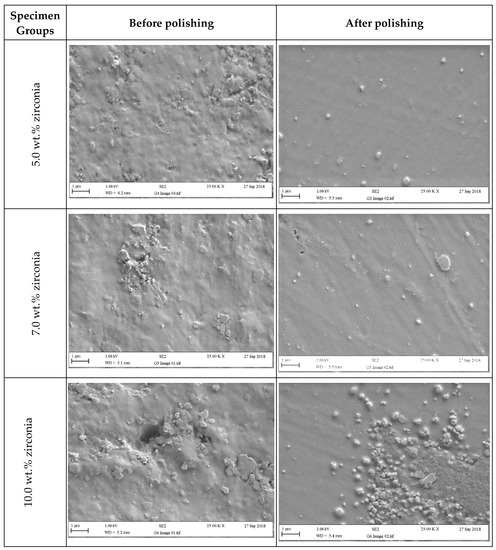 Representative SEM micrographs of tested specimens in groups containing (5 wt.%, 7 wt.%, and 10 wt.% of zirconia) before and after polishing (two minutes).