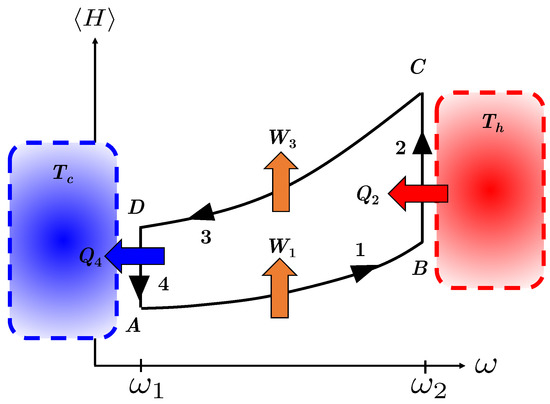 To determine the average heat and work exchanged during each stroke, we use the following method. We determine the internal energy at the beginning of the compression stroke (point A in the cycle) from a thermal equilibrium state with the cold bath. Then using Equation (33), we determine the internal energy at the end of the compression stroke (point B). The change in internal energy between A and B gives the average work done on the system (). We can find the the internal energy at point C using the thermal equilibrium state with the hot bath. The change in internal energy between C and B gives the average heat exchanged with the hot bath (). Again, applying Equation (33), we find the internal energy at the end of the expansion stroke (point D). The change in internal energy between C and D gives the average work done by the system (). Finally, we can then use the difference in internal energy between points D and A to find the average heat exchanged with the cold bath ().