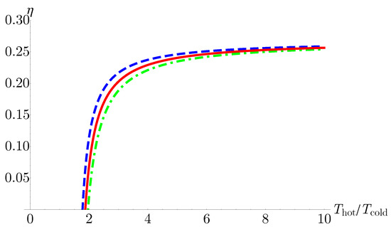 Efficiency as a function of the bath temperature ratio for (blue, dashed), (red, solid), and (green, dot-dashed). Parameters are .