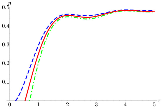 Efficiency as a function of the stroke time for (blue, dashed), (red, solid), and (green, dot-dashed). Parameters are .