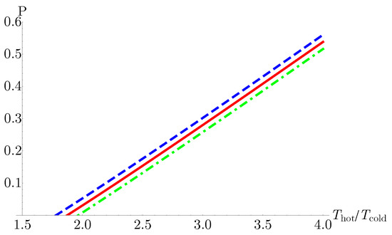 Power as a function of the bath temperature ratio for (blue, dashed), (red, solid), and (green, dot-dashed). Parameters are .