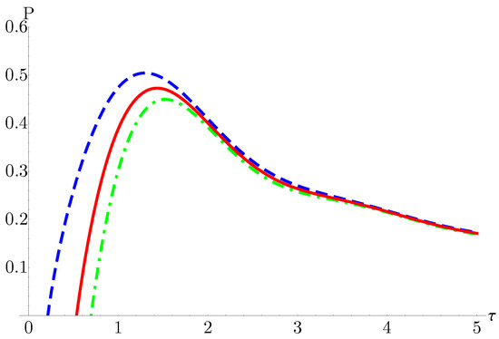 Power as a function of the stroke time for (blue, dashed), (red, solid), and (green, dot-dashed). Parameters are .