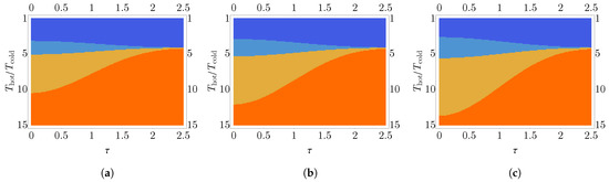 Parameter regimes where the cycle functions as a refrigerator (dark blue, top), heater (light blue, upper middle), accelerator (tan, lower middle) and engine (orange, bottom) for (a) , (b) , and (c) . Parameters are .
