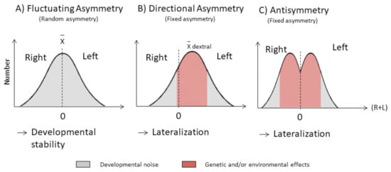 Categories of asymmetry: (A) fluctuating asymmetry represented by minor, non-directional deviations from perfect symmetry limited by the canalization process and the result of developmental noise; (B) directional asymmetry or lateralization process fixed on the same side, dependent on genotype and the influence of environmental (biotic and abiotic) factors throughout life; (C) antisymmetry or lateralization process fixed on the side, which varies randomly among individuals.