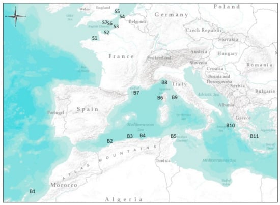 Map of sampling locations by species. Boops boops samplings were B1: Tenerife Island, B2: Gulf of Oran, B3: Gulf of Bejaia, B4: Gulf of Annaba, B5: Gulf of Tunis, B6: Corsica Island, B7: Gulf of Lion, B8: Ligurian Sea, B9: Tyrrhenian Sea, B10: Ionian Sea, and B11: Aegean Sea. Solea solea samplings were S1: Mont Saint Michel Bay, S2: Bay of Seine, S3: Bay of Somme, S4: French coast of the North Sea, S5: Thames Estuary, S6: central area of the eastern English Channel, and S7: English coast of the eastern English Channel.