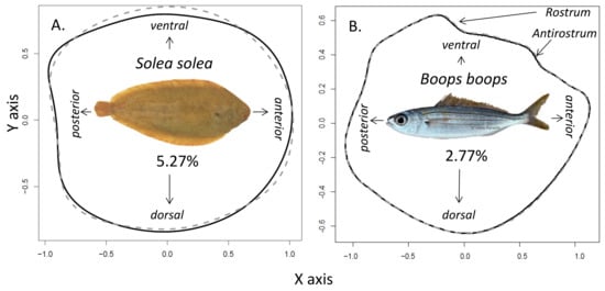 Fish otolith shape is frequently used to discriminate between stock units within a species as a consequence of a number of factors, such as abiotic environmental parameters (e.g., temperature and salinity), biotic parameters (e.g., prey availability), and genetics [,,,,,,]. Other ontogenetic factors, such as fish length [,,,], age [], year class [,,,], sexual maturity [,], and sexual dimorphism [,] can also modify the otolith shape. However, the potential intra-individual factor between the right and left inner otolith as a source of variation in otolith shape has been very understudied. In biology, symmetry in bilaterally symmetrical organisms, including vertebrates, is so consistent as to be considered standard, and it is maintained by homeostatic processes []. However, numerous studies have documented a consistent asymmetry in human upper limb bones, with right side elements typically being larger, while lower limb bones tend to be more symmetric []. Humans preferentially use the right upper limb, and many skeletal studies have argued that lateralized behaviours among humans lead to differences in bone size and shape between sides, especially for the upper limbs []. For the otolith shape, fluctuating asymmetry, defined as the random deviations from perfect symmetry between the left and right otoliths, has been reported for some species of both roundfish and flatfish [,,,]. Directional asymmetry has been measured for 18 fish species. Symmetry between the left and right otoliths, showing the two strictly similar parts of the vestibular system, has been observed in Gadus morhua [,], Coryphaena hippurus [], Xiphias gladius [], Scomber scombrus [], Melanogrammus aeglefinus [], Mullus barbatus [], Clupea harengus [], and Lutjanus kasmira []. Conversely, otolith directional asymmetry, showing lateralization, has been observed for the roundfish Liza ramada [], Diplodus annularis [], Scomberomorus niphonius [], and Merlangius merlangus [] as well as for the flatfish Solea solea [,], Pleuronectes platessa [], Limanda limanda [], and Lepidorhombus whiffiagonis []. This study corroborated the results observed in the otoliths of common sole, and identified otolith asymmetry in bogue. Directional bilateral asymmetry or antisymmetry in fish otoliths could be a result of differences in otolith biomineralisation between the left and right inner ears []. This asymmetry is an indicator of possible dysfunction, considering vestibular sensing []. Otolith directional asymmetry affects the acoustic functionality (sensitivity, temporal processing, and sound localization) [,] and kinetic swimming of fish (aberrant movement pattern or static space sickness) [,,,]. As in a previous study [], our results showed that the observed level of otolith asymmetry in flatfish is higher than that in roundfish. For flatfish, the metamorphosis mechanism is an important source of shape asymmetry between the right and left otoliths because it causes a unique asymmetric body shape and lateralized behaviour due to adaptation to a bottom-living lifestyle, in addition to affecting the otolith shape of fish. In addition to the metamorphosis mechanism, other factors related to ontogeny (such as sexual maturity) could have potential effects on the level of directional bilateral asymmetry.