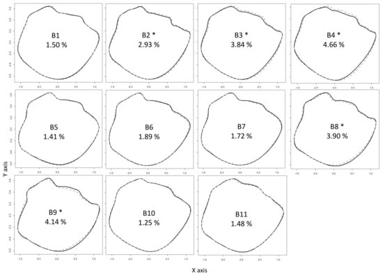Differences between right (black line) and left (grey dotted line) otolith shape of Boops boops by each geographical location with the percentage of directional asymmetry (* = significant asymmetry). B1: Tenerife Island; B2: Gulf of Oran, B3: Gulf of Bejaia, B4: Gulf of Annaba, B5: Gulf of Tunis, B6: Corsica Island, B7: Gulf of Lion, B8: Ligurian Sea, B9: Tyrrhenian Sea, B10: Ionian Sea, B11: Aegean Sea.