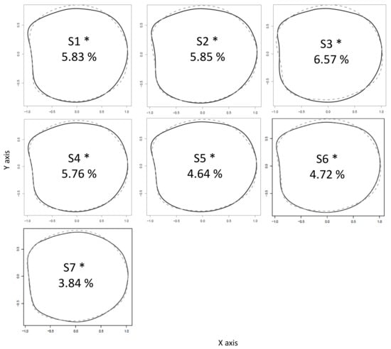 Differences between right (black line) and left (grey dotted line) otolith shape of Solea solea by each geographical location with the percentage of directional asymmetry (* = significant asymmetry). S1: Mont Saint Michel Bay, S2: Bay of Seine, S3: Bay of Somme, S4: French coast of the North Sea, S5: Thames Estuary, S6: central area of the eastern English Channel, S7: English coast of the eastern English Channel.