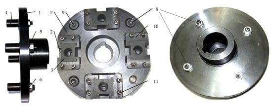 Proposed elastic coupling with bolts and elastic intermediary elements. 1—driver half-coupling; 2—driven half-coupling; 3—elastic intermediary pieces; 4—bolts; 5—grower washers; 6—nuts; 7—intermediary disk; 8- screws; 9—pin; 10—metal supports; 11—screws.