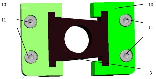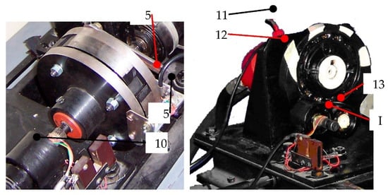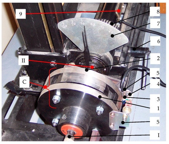 In order to determine the angular deformations of the coupling in a dynamic regime, it was necessary to use a deformation sensor, which was applied on the driven half-coupling 2. The deformation sensor 3 was glued on a metal plate 4 made of spring steel, fixed to a metal plate 5 (bent in the shape of the letter “L”), by means of two screws and two nuts (Figure 8).