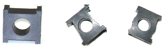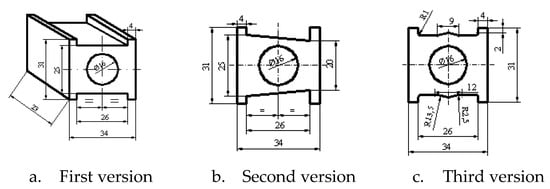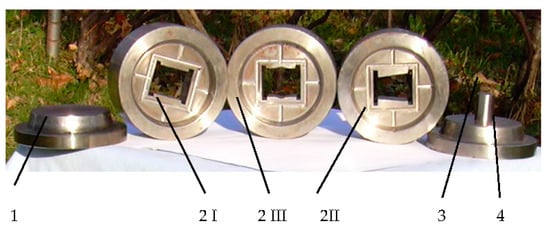 The mold used to obtain the three shapes of non-metallic elements is presented in Figure 5. The mold consists of the upper cover 1, the intermediate ring 2 (existing in three design versions: I, II, III, corresponding to the three shapes of the non-metallic elastic element) and the bolt 3, inserted by pressing in the lower cover 4.
