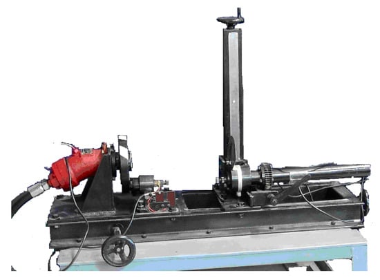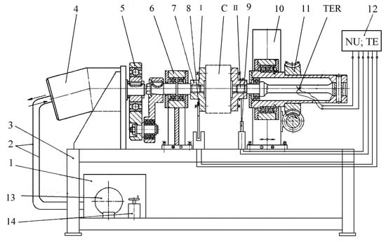 The installation for the dynamic testing of the prototype (Figure 6) consists of the drive group 1, consisting of the electric motor and pump, supply pipes 2, frame 3, hydraulic motor 4, quadrilateral mechanism 5, support bearing 6, support flange 7, transducer pulse 8, the elastic test coupling C, the angle transducer 9, the adjustable support 10, the pre-tensioning system 11, the output shaft II, the measuring and recording system 12, the pressure gauge 13, the hydraulic regulator 14, and the TER resistive electrical transducers.