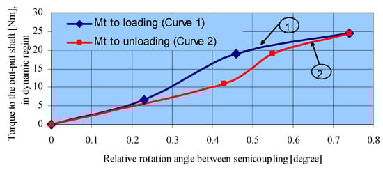 The coupling tests were performed in dynamic mode, taking into account two distinct situations: (1) the two input shaft and output shaft mounted collinearly; (2) the two input shaft-output shafts radially offset by 0.4 mm. In these situations, the variation of the torque at the output shaft was analyzed according to the angular deformation between the two half-couplings, a deformation that occurred as a result of the loading and unloading of the coupling.