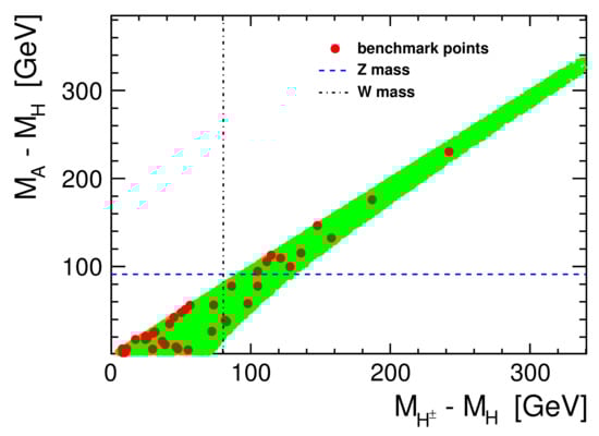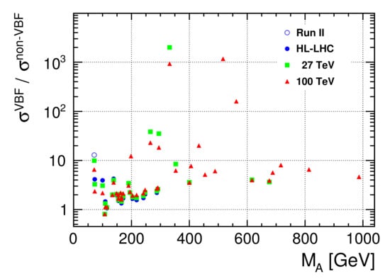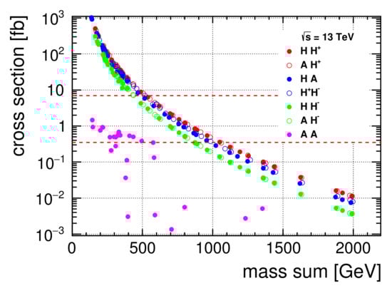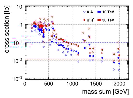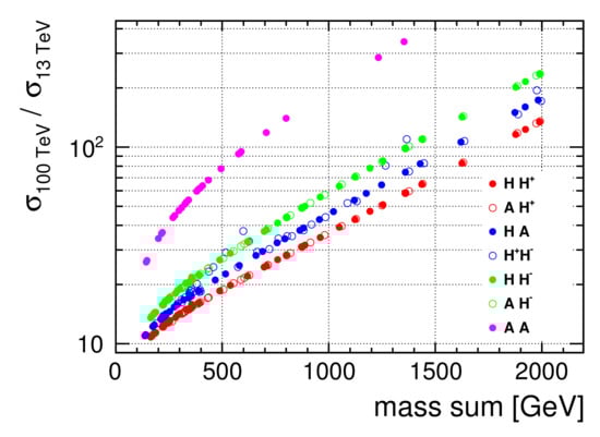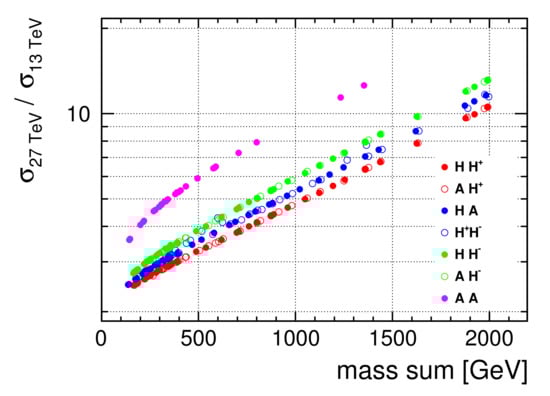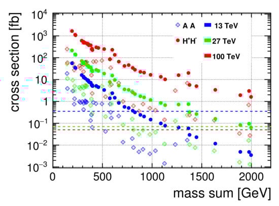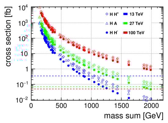 - Akeroyd, A.G.; Hernandez-Sanchez, J.; Mahmoudi, F.; Santos, R.; Akeroyd, A.; Moretti, S.; Yagyu, K.; Yildirim, E.; Khater, W.; Krawczyk, M.; et al. Prospects for charged Higgs searches at the LHC. Eur. Phys. J. C 2017, 77, 276. [Google Scholar] [CrossRef]