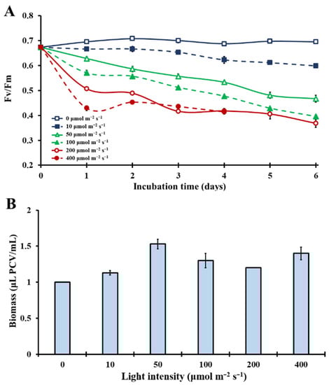 (A): Kinetics of the microalgal photosynthetic efficiency, expressed in Fv/Fm, over the incubation time under different light intensities (0–400 μmol m−2 s−1) in an air atmosphere with 0.04% CO2 (p < 0.05 for each day). (B): Microalgal biomass concentration expressed in μL PCV/mL on the sixth incubation day, over different light intensities (0–400 μmol m−2 s−1). Significantly different are the biomass concentrations of the following treatments: 0 μmol m−2 s−1 versus 50, 100 and 400 μmol m−2 s−1; 10 μmol m−2 s−1 versus 50 μmol m−2 s−1 and 50 μmol m−2 s−1 versus 200 μmol m−2 s−1 (p < 0.05).