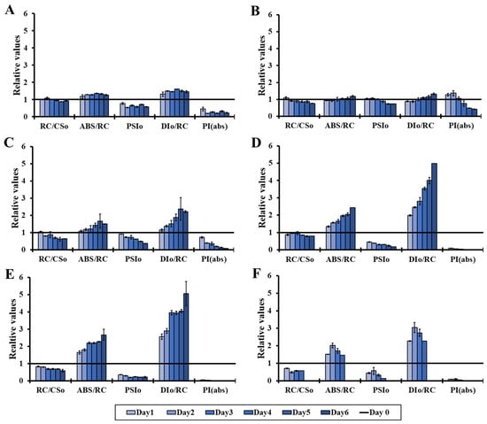 Changes in RC/CS0, ABS/RC, PSI0, DI0/RC and PI(abs) (OJIP test) over the 6 days of incubation time compared to the corresponding values of day 0, under different light intensities (0–400 μmol m−2 s−1) in an air atmosphere (0.04% CO2). (A): 0 μmol m−2 s−1, (B): 10 μmol m−2 s−1, (C): 50 μmol m−2 s−1, (D): 100 μmol m−2 s−1, (E): 200 μmol m−2 s−1 and (F): 400 μmol m−2 s−1.