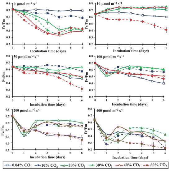 Kinetics of the microalgal photosynthetic efficiency, expressed in Fv/Fm, over the incubation time under different light intensities (0–400 μmol m−2 s−1) in an air atmosphere with different CO2 concentrations (0.04–60%) (p < 0.05 for each light intensity and each day).