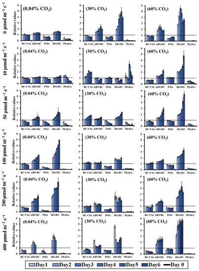 Changes in RC/CS0, ABS/RC, PSI0, DI0/RC and PI(abs) (OJIP test) over the 6 days of incubation time compared to the corresponding values of day 0, under different light intensities (0–400 μmol m−2 s−1) in an air atmosphere with 0.04% CO2, 30% CO2 and 60% CO2.