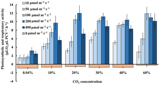 Photosynthetic and respiratory activities of microalgae expressed in μL O2 μL PCV−1 h−1 cultivated in different light intensities (0–400 μmol m−2 s−1) in an air atmosphere with different CO2 concentrations (0.04–60%) (p < 0.05 for each light intensity, each CO2 concentration and each day).