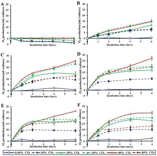Kinetics of total O2 production per microalgal culture over the incubation time under different light intensities (0–400 μmol m−2 s−1) in an air atmosphere with different CO2 concentrations (0.04–60%). (A): 0 μmol m−2 s−1, (B): 10 μmol m−2 s−1, (C): 50 μmol m−2 s−1, (D): 100 μmol m−2 s−1, (E): 200 μmol m−2 s−1 and (F): 400 μmol m−2 s−1 (p < 0.05 for each light intensity and each day).