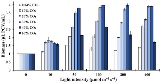 Microalgal biomass concentration expressed in μL PCV/mL on the sixth incubation day, over different light intensities (0–400 μmol m−2 s−1) and CO2 concentrations (0.04–60%) (p < 0.05 for each light intensity, each CO2 concentration and each day).
