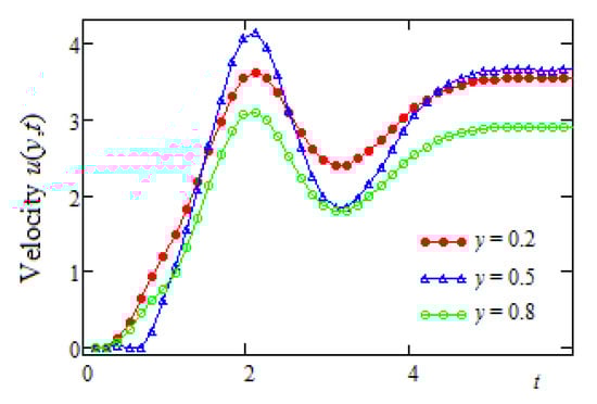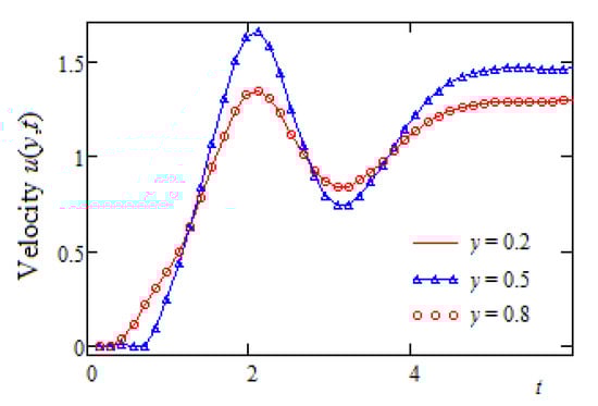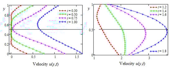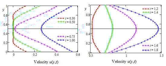 In Figure 1, the profiles of the non-symmetric velocity versus y at several values of the time t are presented. The velocities of the two walls of the channel slightly increased from zero to constant velocities of three and two at high values of the time t. Their movement generated the fluid’s motion and the velocity profiles change in space and time. At small values of time t, the fluid moved slower in the central area of the channel, but the opposite behavior appeared later. In addition, the curves representing the fluid velocity were asymmetric with respect to the symmetry plane of the channel. Furthermore, the fluid located in the lower semi-channel moved faster than the fluid from the upper semi-channel. Of course, this behavior was due to the fact that the speed of the lower plate was higher than the velocity of the upper one.
