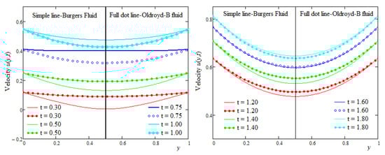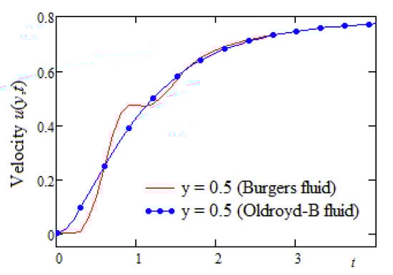 Figure 3 and Figure 4 were sketched for the flow of the fluid induced by the channel’s walls, which moved in their planes with equal velocities in the same direction. As expected, in this case, the velocity profiles were symmetric with respect to the median plane of the channel. Like in Figure 1, as was to be expected, the fluid velocity increased over time. The symmetry property of the flow in this case is also highlighted in Figure 4, which clearly shows that the velocity’s diagrams corresponding to the symmetric positions are identical. In all these figures, we used the same numerical values for the dimensionless parameters, namely and For comparison, the velocities’ profiles corresponding to the Oldroyd-B () and Burgers’ fluids against y and their time evolutions at the middle of the channel are presented together in Figure 5 and Figure 6. The values of the non-dimensional material coefficients which were used here were and for the Oldroyd-B and Burgers’ fluids, respectively. At small values of time t, as is apparent from the results from the graphical representations, the Burgers’ fluid flowed slower than the Oldroyd-B fluid, but this behavior changed many times later. Figure 6 clearly shows that, as expected, for large values of time t, the velocities of the two fluids became almost identical.