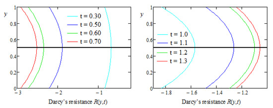 In Figure 7, the Darcy’s resistance versus y is depicted for the symmetric case at different values of time t. At the beginning of the motion (up to a critical value of t being less than one), the Darcy’s resistance was a decreasing function with respect to time t, but its behavior changed over time. As expected, it was symmetric with respect to the median plane and took on the minimum values on the lateral walls. For the parameters and , the same values as for Figure 1, Figure 2, Figure 3 and Figure 4 were used.