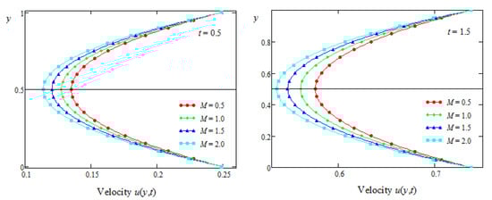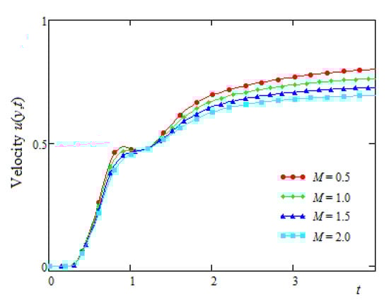 Finally, the profiles of the velocity field versus the spatial variable y and its time variations at the middle of the channel are presented in Figure 8 and Figure 9, respectively, for the symmetric flow at several values of the non-dimensional magnetic parameter M. From these graphical representations, it is clear that the fluid velocity had a decreasing function with respect to the parameter M. This was possibly due to the application of a transverse magnetic field inducing a resistive force of a Lorentz type, which tends to reduce the fluid velocity. From Figure 9, as well as from Figure 2, Figure 4 and Figure 6, it is clearly shown that at large values of time t, the fluid velocity tended toward constant, asymptotic values. The values of the parameters and from the equalities of Equation (24) which have been used here corresponded, respectively, to and