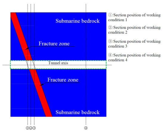 As shown in Figure 3, four representative sections were selected at the intersection of the submarine tunnel and the fault, denoted as Case 1, Case 2, Case 3, and Case 4, respectively. In Figure 4, the dark blue part is the submarine bedrock, the light blue is the grouting ring, and the red part is the fault fracture zone. A fluid–solid coupling simulation was performed for the above four working conditions using the FLAC3D numerical simulation software. The influence of the fault fracture zone on the overall stability of the submarine tunnel under different working conditions was compared and analyzed.